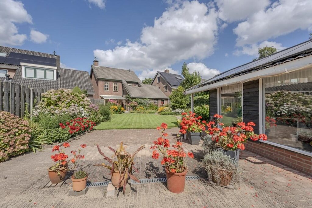 De achtertuin is diep en biedt een vrij uitzicht over de weilanden en dieren achter de woning. Dat zorgt voor een gevoel van rust en ruimte. Bij de vrijstaande garage bevindt zich een overkapping, een fijne plek om beschut te zitten op warme dagen of juist in de avond nog even buiten te genieten.