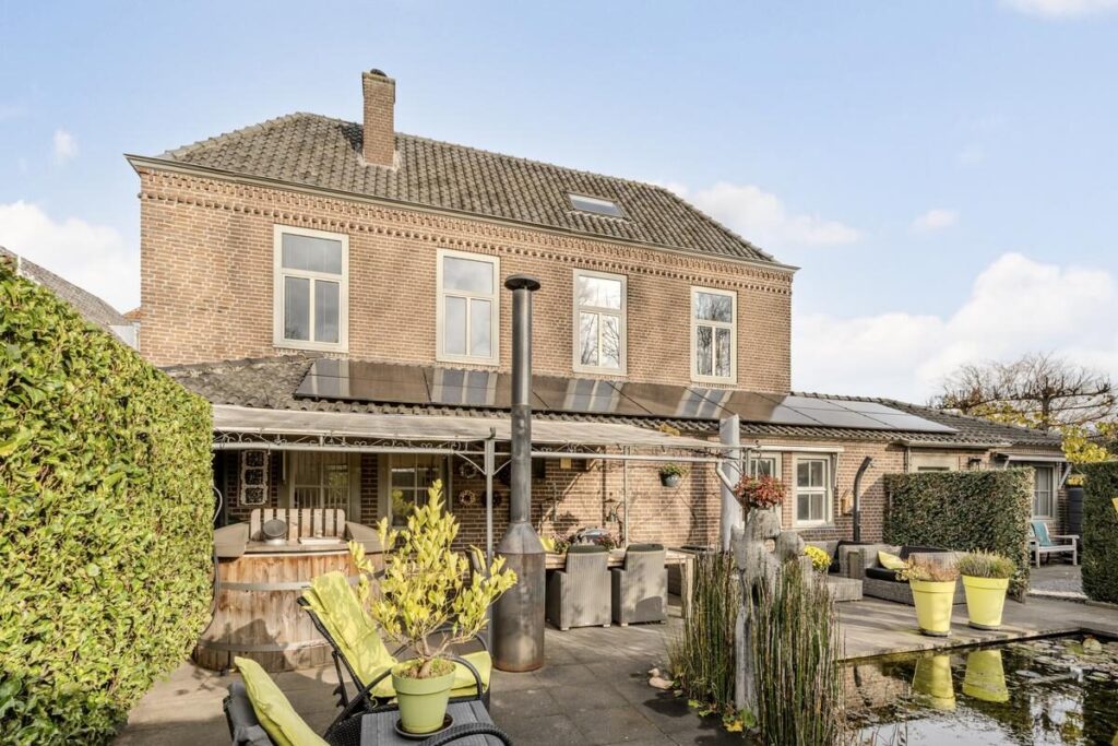 De tuin is fraai aangelegd en nodigt uit om te genieten. Met diverse terrassen is er altijd wel een fijn plekje om te ontspannen, of je nu in de zon wilt zitten of juist de schaduw opzoekt. De overkapping biedt een heerlijke beschutte zitplek voor lange zomeravonden. De vijver zorgt voor een rustgevende sfeer en een mooie uirstraling. Dankzij de zuidoostelijke ligging geniet je hier de hele dag door van de zon.